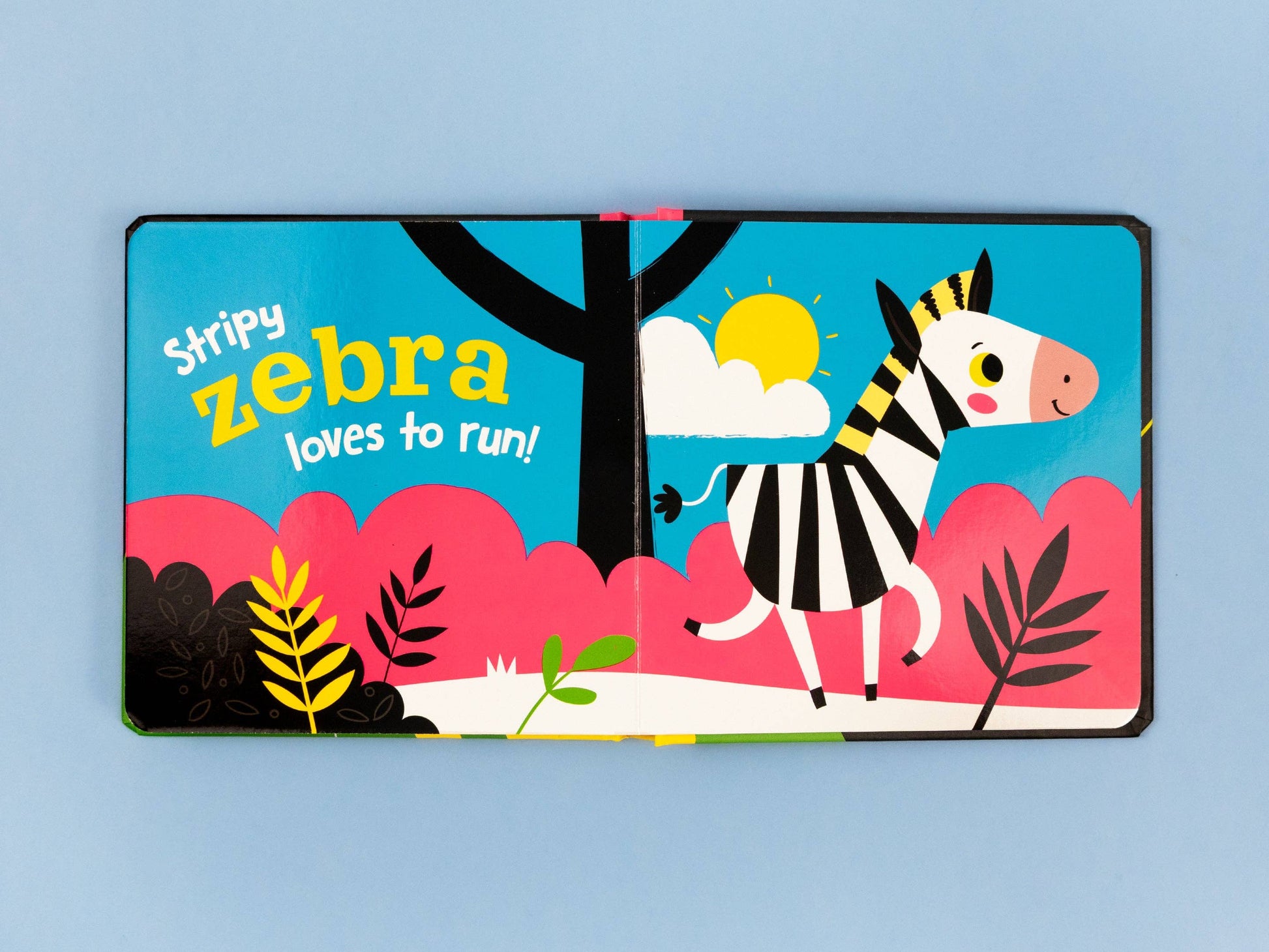 This playful board book is specially designed to delight babies and toddlers with bold, high-contrast colours and adorable prehistoric characters. From the stripy Zebra to the feathery Flamingos, each page has vibrant artwork that engages developing eyes and curious minds.